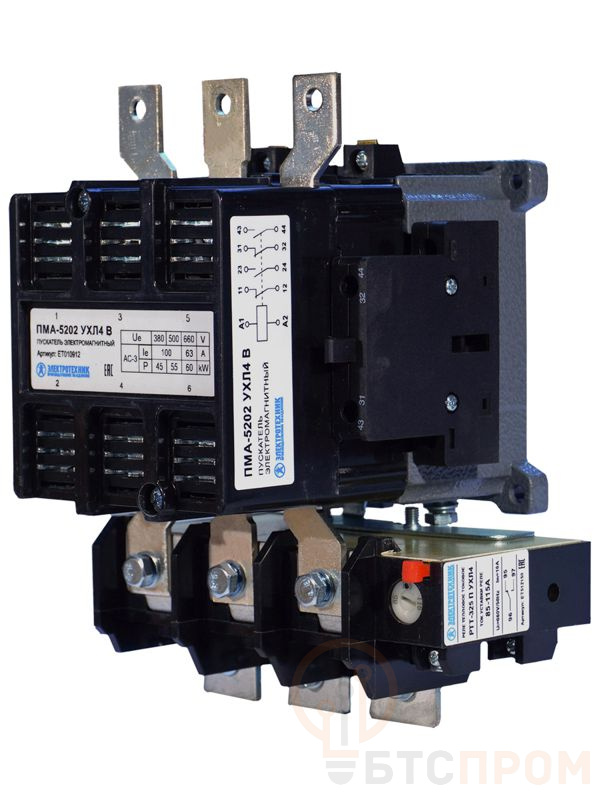 Пускатель электромагнитный ПМА-5202 УХЛ4 В 100А 380В 2НО+2НЗ IP00 нереверсивный с реле РТТ-325 85-115А Электротехник ET010912