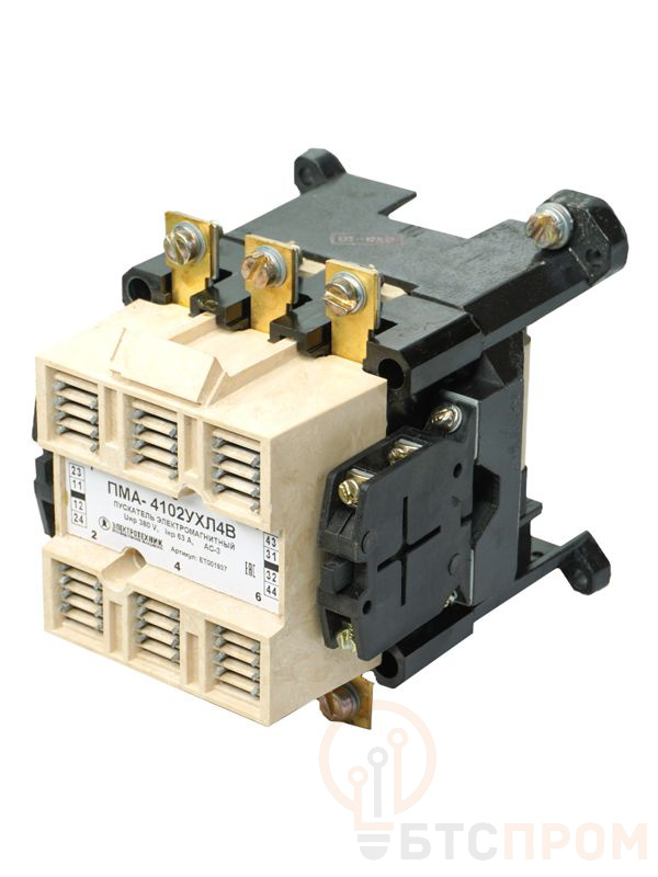 Пускатели электромагнитные серии ПМА-4000 предназначены для применения в стационарных установках для дистанционного пуска, остановки и реверсирования трёхфазных асинхронных электродвигателей с короткозамкнутым ротором на напряжение до 660 В переменного тока 50 и 60 Гц. При наличии тепловых реле пускатель осуществляет защиту управляемых электродвигателей от: * перегрузки; * токов, возникающих при обрыве одной из фаз; * асимметрии фаз. * Пускатели отличаются высокой механической и коммутационной износостойкостью, что обеспечивает длительный срок службы даже в условиях интенсивной эксплуатации; * Соответствует требованиям ГОСТ, предъявляемым к аппаратам промышленного назначения, обеспечивает высокую надёжность срабатывания; * Отсутствие шумов и повышенная надёжность работы; * Простота конструкции и высокая надёжность, испытанная временем эксплуатации.