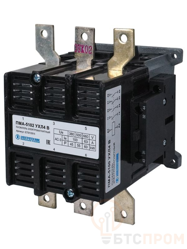 Пускатель электромагнитный ПМА-5102 УХЛ4 от производителя "Электротехник" — это надежный аппарат для управления и распределения электроэнергии в промышленных сетях. Предназначен для дистанционного пуска, остановки и защиты трехфазных асинхронных электродвигателей. Номинальный ток составляет 100А при напряжении до 380В. Коммутационная схема включает 2 нормально разомкнутых (2НО) и 2 нормально замкнутых (2НЗ) контакта, что обеспечивает гибкость в построении систем управления. Исполнение УХЛ4 гарантирует стабильную работу в условиях умеренного и холодного климата. Степень защиты IP00 требует установки в защищенных щитовых помещениях. Идеально подходит для использования в системах автоматизации производственных линий, станков, вентиляционного оборудования и насосных станций.