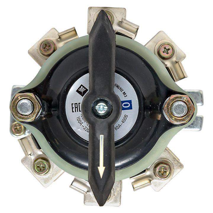 Корпус имеет степень защиты IP00, что предполагает эксплуатацию в закрытых электрощитах и сухих помещениях для защиты от случайного прикосновения. Исполнение 3 с черной рукояткой и клювообразным указателем положения. Устройство используется для ручного управления трехфазными электродвигателями, переключения цепей освещения, ввода резервного питания и в качестве вводного переключателя в распределительных щитах.