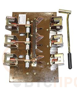 Переключатель оснащен правой боковой рукояткой для удобного управления и комплектуется дугогасительными камерами, которые эффективно гасят электрическую дугу, повышая безопасность и срок службы аппарата. Исполнение У3 указывает на климатическое исполнение для работы в условиях умеренного климата. Степень защиты IP00 предполагает использование в закрытых щитовых помещениях.