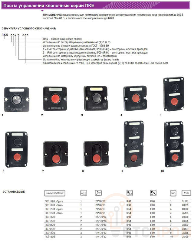 Пост кноп. ПКЕ-122/3 "Пуск-Стоп" 2 черн. 1 красн. Электродеталь представляет собой пластмассовую панель черного цвета с подпружиненными толкателями и контактными элементами, имеющими по два изолированных друг от друга электрических контакта. Контактные зажимы допускают присоединение к каждому зажиму одного медного или алюминиевого провода сечением 2,5 кв.мм или 2 медных проводов сечением не более 1,5 кв.мм. Кнопки плоские, 3 шт., черного и одна красного цвета. IP54. Применяются для встройки в нишу.