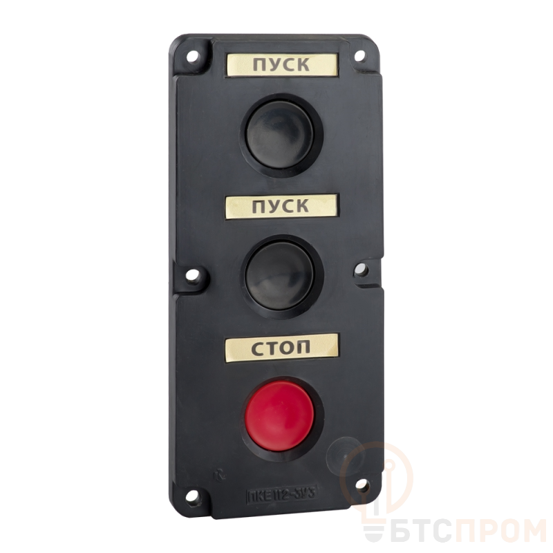 Кнопочный пост шириной 80 мм, высотой 180 мм и глубиной 70 мм, в котором толкателем выступает 2 черных и красная кнопка .