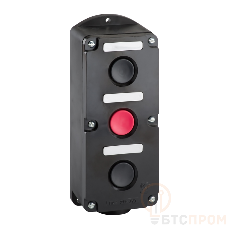 Кнопочный пост шириной 80 мм, высотой 180 мм и глубиной 70 мм, в котором толкателем выступает 2 черных и красная кнопка .