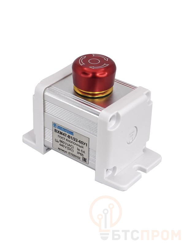 Пост управления BXM47-B1/22-65У1 от производителя «Электротехник» — это надежный аппарат для коммутации цепей управления в промышленных электроустановках. Модель оснащена одной грибовидной кнопкой с механизмом фиксации, имеющей универсальную контактную группу 1C1NO1NC (один замыкающий и один размыкающий контакт). Яркий красный цвет корпуса обеспечивает высокую видимость и используется для кнопок аварийного останова или важных операций «Стоп».