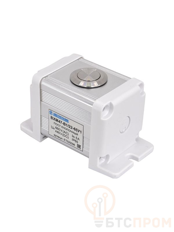 Пост управления кнопочный BXM47-B1/22-65У1 от производителя «Электротехник» — это надежное устройство для коммутации электрических цепей управления в стационарных установках. Модель оснащена одной цилиндрической кнопкой, имеющей универсальную контактную группу 1C1NO1NC (один замыкающий и один размыкающий контакт), что обеспечивает гибкость в построении схем управления. Корпус устройства выполнен из прочного пластика серебристого цвета, обладающего стойкостью к механическим воздействиям и загрязнениям.