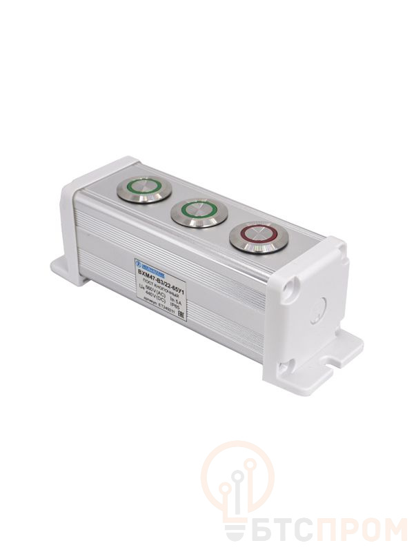 Пост управления BXM47-B3/22-65У1 от производителя Электротехник — это надежное устройство для дистанционного управления различными промышленными системами и механизмами. Модель оснащена тремя цилиндрическими кнопками: две зеленые и одна красная, каждая из которых имеет контактную группу 1C1NO1NC (один замыкающий и один размыкающий контакт).