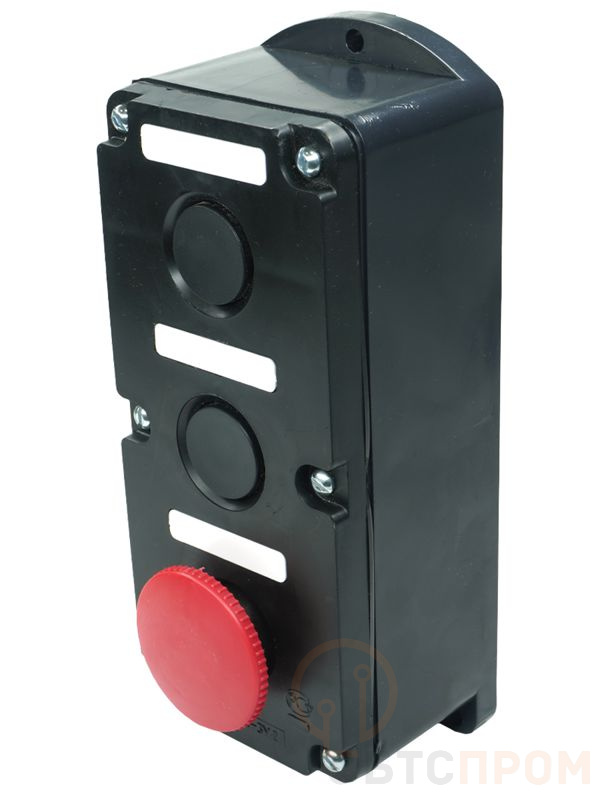 Модель оснащена черным цилиндрическим основанием и тремя накладными кнопками с красными грибовидными головками, что обеспечивает удобство и безопасность оператора. Основная сфера применения — управление станками, грузоподъемными механизмами (кранами, тельферами), а также другими производственными системами, где требуется надежное и безопасное переключение режимов работы.
