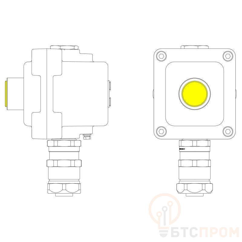 LCSD-01-B-MC-L1Y(220)x1-PCMB-KAEPM3MHK-26 Взрывозащищенный местный пост управления из алюминия на 1 эл.управления. Маркировка: 1Ex d IIB T5 Gb / Ex tb IIIC T95°С Db / IP66 Температура окружающей среды: От -60°C до +40°C Элементы управления L1 – индикатор. Цвет Желтый - 1шт. Кабельные вводы Снизу: Взрывозащищенный кабельный ввод серии КАЕРМ для бронированногоинебронированного кабеля в металлорукаве COSMEC Dn:26 М25х1,5 d:11,8-18мм. Никелированная латунь IP66/IP68 Сверху: Взрывозащищенная заглушка Ex d e, М25x1,5. Никелированная латунь. IP66/67/68