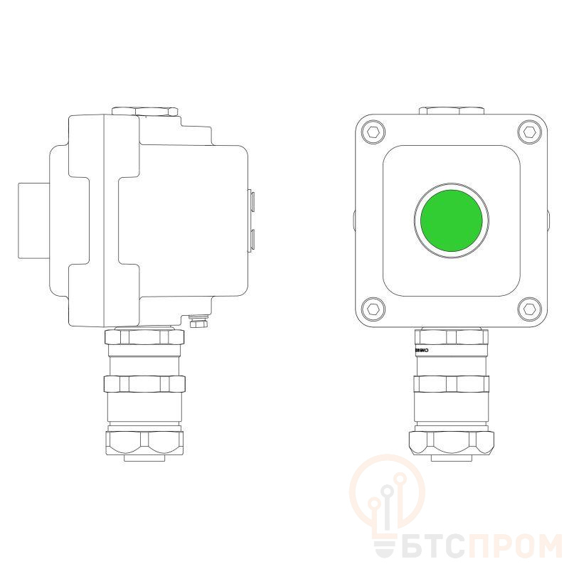 LCSD-01-B-MC-P1G(11)x1-PCMB-KAEPM3MHK-26 Взрывозащищенный местный пост управления из алюминия на 1 эл.управления. Маркировка: 1Ex d IIB T5 Gb / Ex tb IIIC T95°С Db / IP66 Температура окружающей среды: От -60°C до +40°C Элементы управления P1 – кнопка без фиксации. Цвет зеленый - 1шт. Кабельные вводы Снизу: Взрывозащищенный кабельный ввод серии КАЕРМ для бронированногоинебронированного кабеля в металлорукаве COSMEC Dn:26 М25х1,5 d:11,8-18мм. Никелированная латунь IP66/IP68 Сверху: Взрывозащищенная заглушка Ex d e, М25x1,5. Никелированная латунь. IP66/67/68