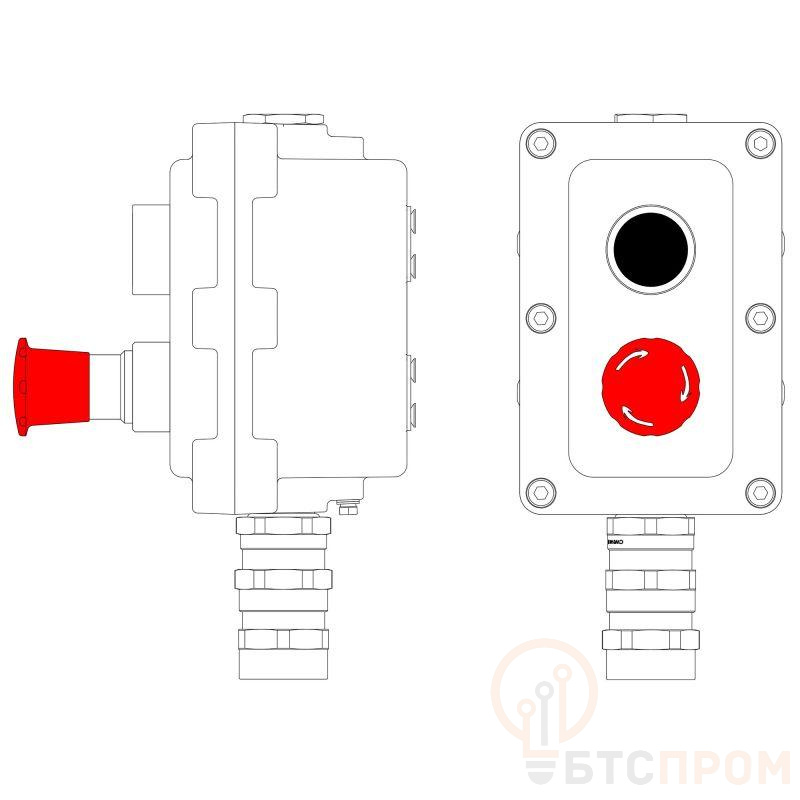 Взрывонепроницаемый пост управления из алюминия LCSD-02-B-MB-P1B(11)x1-P6R(11)x1-PBMB-KA2MHK Взрывозащищенный местный пост управления из алюминия на 2 эл.управления. Маркировка: 1Ex d IIB T5 Gb / Ex tb IIIC T95°С Db / IP66 Температура окружающей среды: От -60°C до +40°C Элементы управления P1 – кнопка без фиксации. Цвет черный - 1шт. P6 – кнопка грибовидная с фиксацией, отпускание поворотом (размер O40 мм). Цвет красный - 1шт. Кабельные вводы Снизу: Взрывозащищенный кабельный ввод серии КА для бронированного кабеляМ20х1,5 d:5,8-12мм D:9-17мм. Никелированная латунь IP66/IP68 Сверху: Взрывозащищенная заглушка Ex d e, М20x1,5. Никелированная латунь. IP66/67/68