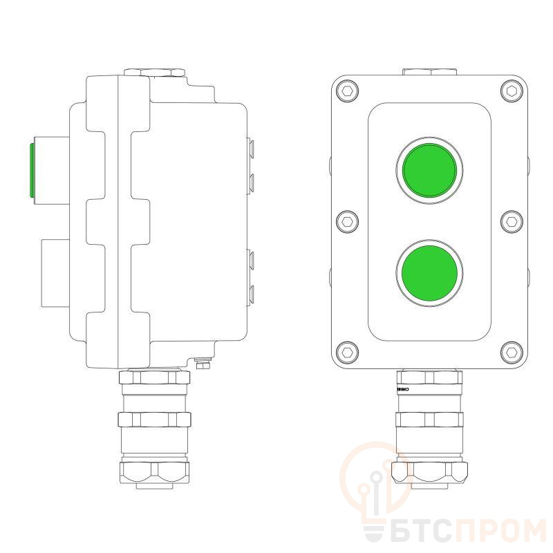 LCSD-02-B-MC-L1G(220)x1-P1G(11)x1-PCMB-KAEPM3MHK-26 Взрывозащищенный местный пост управления из алюминия на 2 эл.управления. Маркировка: 1Ex d IIB T5 Gb / Ex tb IIIC T95°С Db / IP66 Температура окружающей среды: От -60°C до +40°C Элементы управления L1 – индикатор. Цвет зеленый - 1шт. P1 – кнопка без фиксации. Цвет зеленая - 1шт. Кабельные вводы Снизу: Взрывозащищенный кабельный ввод серии КАЕРМ для бронированногоинебронированного кабеля в металлорукаве COSMEC Dn:26 М25х1,5 d:11,8-18мм. Никелированная латунь IP66/IP68 Сверху: Взрывозащищенная заглушка Ex d e, М25x1,5. Никелированная латунь. IP66/67/68