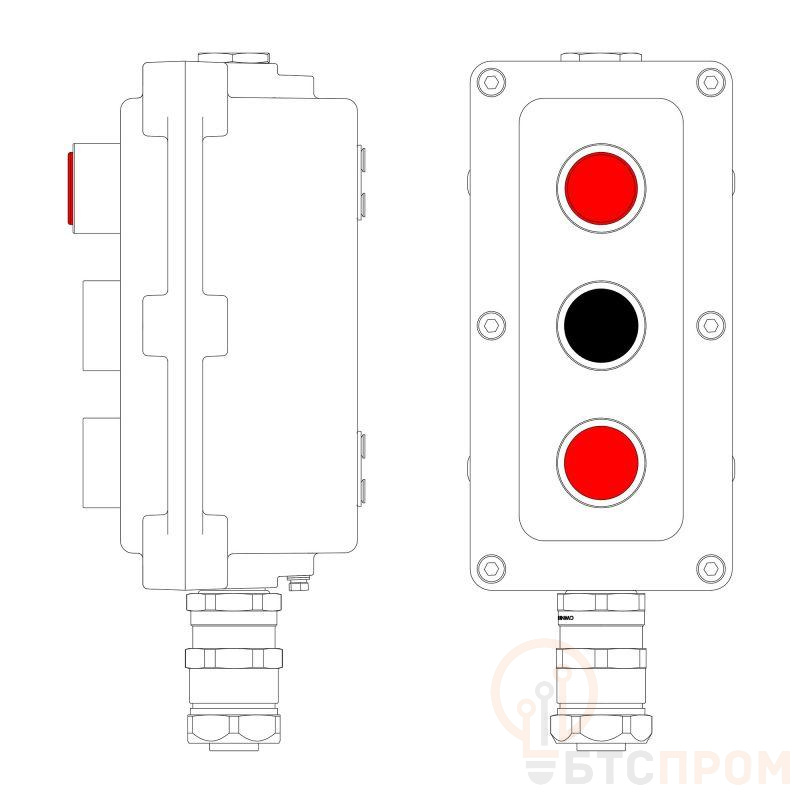 LCSD-03-B-MB-L1R(220)x1-P1B(11)x1-P1R(11)x1-PBMB-KAEPM2MHK-20 Взрывозащищенный местный пост управления из алюминия на 3 эл.управления. Маркировка: 1Ex d IIB T5 Gb / Ex tb IIIC T95°С Db / IP66 Температура окружающей среды: От -60°C до +40°C Элементы управления L1 – индикатор. Цвет красный - 1шт. P1 – кнопка без фиксации. Цвет черный - 1шт. P1 – кнопка без фиксации. Цвет красный - 1шт. Кабельные вводы Снизу: Взрывозащищенный кабельный ввод серии КАЕРМ для бронированного инебронированного кабеля в металлорукаве COSMEC Dn:20 М20х1,5 d:5,8-12мм.Никелированнаялатунь IP66/IP68 Сверху: Взрывозащищенная заглушка Ex d e, М20x1,5. Никелированная латунь. IP66/67/68