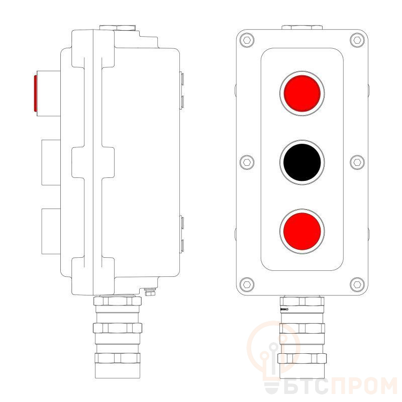 LCSD-03-B-MC-L1R(220)x1-P1B(11)x1-P1R(11)x1-PCMB-KA3MHK Взрывозащищенный местный пост управления из алюминия на 3 эл.управления. Маркировка: 1Ex d IIB T5 Gb / Ex tb IIIC T95°С Db / IP66 Температура окружающей среды: От -60°C до +40°C Элементы управления L1 – индикатор. Цвет красный - 1шт. P1 – кнопка без фиксации. Цвет черный - 1шт. P1 – кнопка без фиксации. Цвет красный - 1шт. Кабельные вводы Снизу: Взрывозащищенный кабельный ввод серии КА для бронированного кабеляМ25х1,5 d:11,8-18мм D:15-25мм. Никелированная латунь IP66/IP68 Сверху: Взрывозащищенная заглушка Ex d e, М25x1,5. Никелированная латунь. IP66/67/68