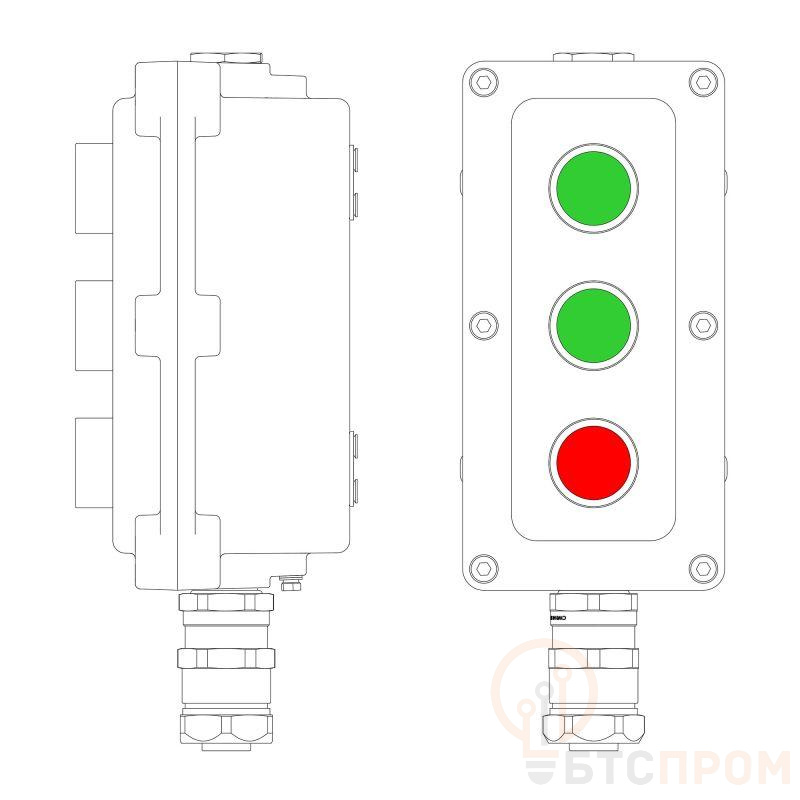 LCSD-03-B-MC-P1G(11)x1-P1G(11)x1-P1R(11)x1-PCMB-KAEPM3MHK-20 Взрывозащищенный местный пост управления из алюминия на 3 эл.управления. Маркировка: 1Ex d IIB T5 Gb / Ex tb IIIC T95°С Db / IP66 Температура окружающей среды: От -60°C до +40°C Элементы управления P1 – кнопка без фиксации. Цвет зеленый - 2шт. P1 – кнопка без фиксации. Цвет красный - 1шт. Кабельные вводы Снизу: Взрывозащищенный кабельный ввод серии КАЕРМ для бронированногоинебронированного кабеля в металлорукаве COSMEC Dn:20 М25х1,5 d:11,8-18мм. Никелированная латунь IP66/IP68 Сверху: Взрывозащищенная заглушка Ex d e, М25x1,5. Никелированная латунь. IP66/67/68