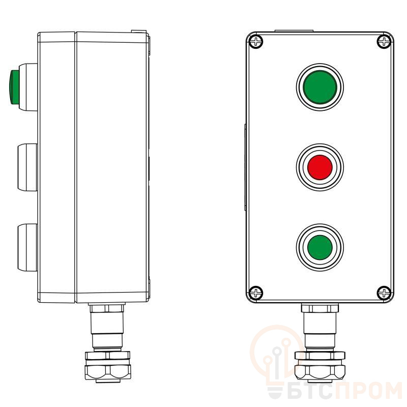 Взрывозащищенный пост управления из алюминия CPE-A-14-(1xLG(250)-1xP1R(11)-1xP1G(11))-1xKAEPM2MHK-20(C)1Ex d e IIC Т5 Gb / Ex tb IIIC T95°C Db IP66 Un=400 В, In=16 А Взрывозащищенный пост управления из алюминия 220x120x90мм 1Ex d e IIC Т5 Gb / Ex tb IIIC T95°C Db IP66 Температурный режим Т5 40°C Количество элементов управления: Сигнальный блок 20V-250V AC/DC + Светофильтр Зеленый 1 шт. Контактный блок 1NC/1NO + Кнопка P1 Красная 1 шт. Контактный блок 1NC/1NO + Кнопка P1 Зеленая 1 шт. Количество клемм: Вводы Сторона C: Взрывозащищенный кабельный ввод серии КАЕРМ для бронированного инебронированного кабеля в металлорукаве COSMEC Dn:20 М20х1,5 d:5,8-12мм.Никелированнаялатунь IP66/IP68 1 шт.