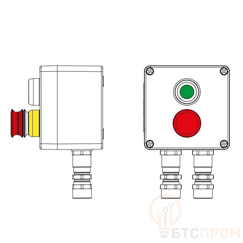 Взрывозащищенный пост управления из полиэстера CPE-P-03-(1xP1G(11)-1xP3E(11))-2xKA2MHK(C)1Ex d e IIC Т5 Gb / Ex tb IIIC T95°C Db IP66/КЗ/ШЗ Un=400 В, In=16 А Взрывозащищенный пост управления GRP 120x120x90мм 1Ex d e IIC Т5 Gb / Ex tb IIIC T95°C Db IP66 Температурный режим Т5 40°C Кольца заземления Зажим заземления Количество элементов управления: Контактный блок 1NC/1NO + Аварийная кнопка P3E Красная 1 шт. Контактный блок 1NC/1NO + Кнопка P1 Зеленая 1 шт. Количество клемм: Вводы Сторона C: Кабельный ввод серии КА для бронированного кабеля М20х1,5 d:5,8-12мм D:9-17мм. Никелированная латунь IP66/IP68 2 шт.