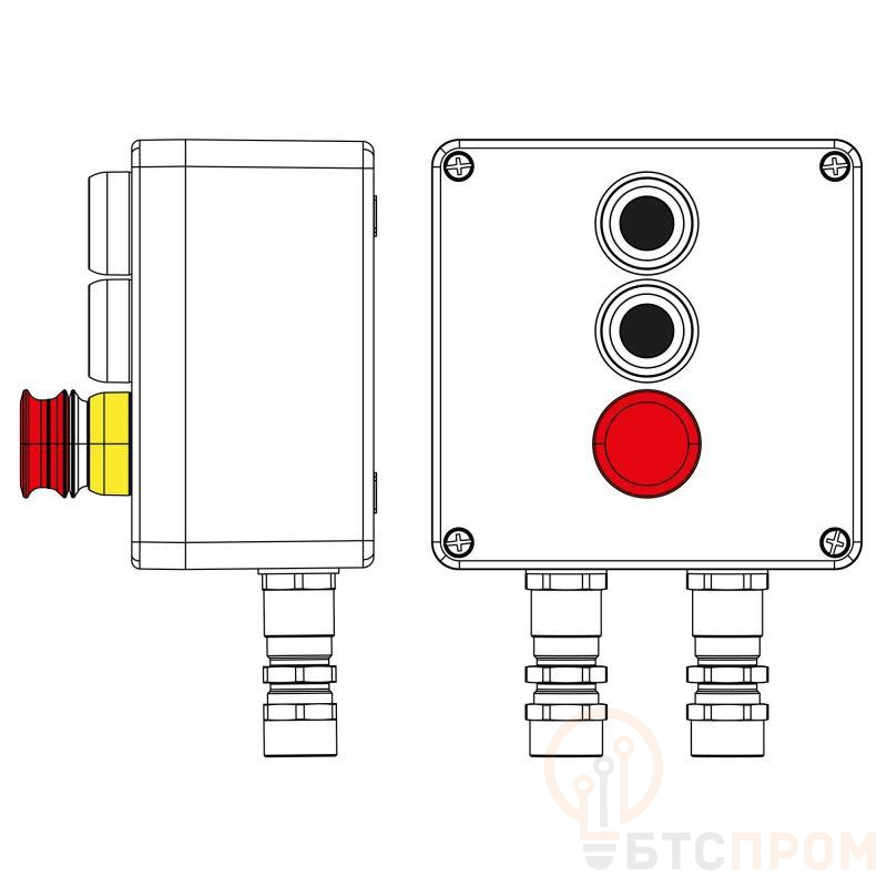 Взрывозащищенный пост управления из полиэстера CPE-P-05-(2xP1B(11)-1xP3E(11))-2xKA2MHK(C)1Ex d e IIC Т5 Gb / Ex tb IIIC T95°C Db IP66/КЗ/ШЗ Un=400 В, In=16 А Взрывозащищенный пост управления GRP 160x160x90мм 1Ex d e IIC Т5 Gb / Ex tb IIIC T95°C Db IP66 Температурный режим Т5 40°C Кольца заземления Зажим заземления Количество элементов управления: Контактный блок 1NC/1NO + Аварийная кнопка P3E Красная 1 шт. Контактный блок 1NC/1NO + Кнопка P1 Черная 2 шт. Количество клемм: Вводы Сторона C: Кабельный ввод серии КА для бронированного кабеля М20х1,5 d:5,8-12мм D:9-17мм. Никелированная латунь IP66/IP68 2 шт.