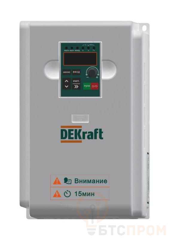 Преобразователи частоты ПЧ-510; Входное напряжение 380В 3 фазы; IP 20; тормозной модуль; Номинальные характеристики (P-тип): Un = 3Ф 400В; Pn = 7,5 кВт; In = 13 А. Перегрузочная способность (P-тип): 150% в течение 60 с, 180% в течение 3 с. Номинальные характеристики (G-тип): Un = 3Ф 400В; Pn = 11 кВт; In = 17 А. Перегрузочная способность (G-тип): 120% в течение 60 с, 150% в течение 3 с. Частотные преобразователи Dekraft представляют широкий спектр полностью протестированых и готовых к подключению решений для управления электродвигателями. Коммуникационный протокол: Modbus RTU. Встроенная функция пожарного режима. Съёмная LED панель оператора.