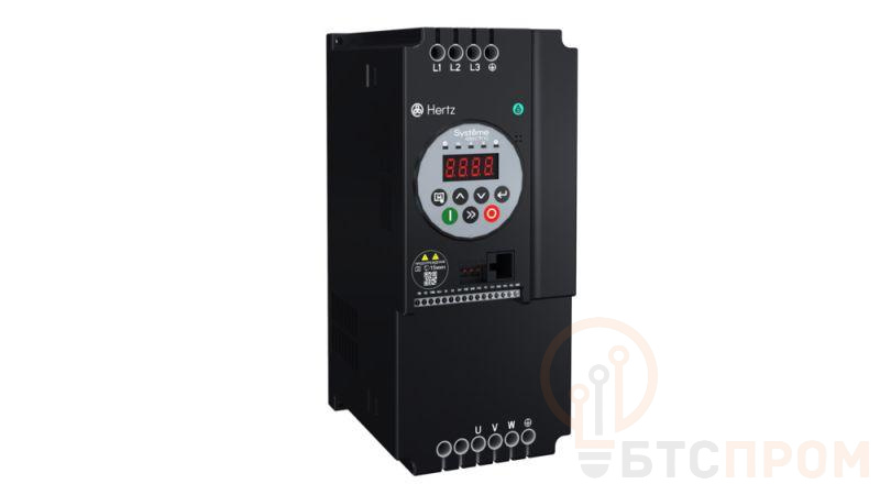 Преобразователь частоты серии SystemeVar Hertz типа STV050 для насосных и вентиляторных применений. Номинальные характеристики (P-тип): Un = 3Ф 400В; Pn = 11 кВт; In = 25 А. Перегрузочная способность (P-тип): 120% в течение 60 с, 150% в течение 3 с (время цикла = 300 с). Номинальные характеристики (G-тип): Un = 3Ф 400В; Pn = 7,5 кВт; In = 17 А. Перегрузочная способность (P-тип): 150% в течение 60 с, 180% в течение 3с (время цикла = 300 с). Выходная частота: до 599 Гц. Диапазон питающего напряжения: 3Ф 380 (-15%) ~ 440В (+10%). Встроенная (несъёмная) LED панель оператора. Встроенный-ЭМС фильтр (Класс С3, согл. EN 61800-3). Коммуникационный протокол: Modbus RTU. Кол-во входов/выходов: 4DI, 1AI, 1DO, 1RO, 1AO. Степень защиты: IP20. Покрытие плат (Класс 3С2, согл. EN 60721-3-3). Температура окружающей среды: от -20°C до +50°C (до +40°C без ухудшения номинальных характеристик). Скалярное управление, векторное управление (без обратной связи по скорости). Функции для насосных и вентиляторных применений. Пожарный режим с функцией контроля целостности кабеля двигателя. Монтаж “бок-о-бок” (минимальное расстояние между соседними ПЧ: 50 мм). Типоразмер D. ШxВxГ (мм): 106х240х146. Вес: 2,2 кг