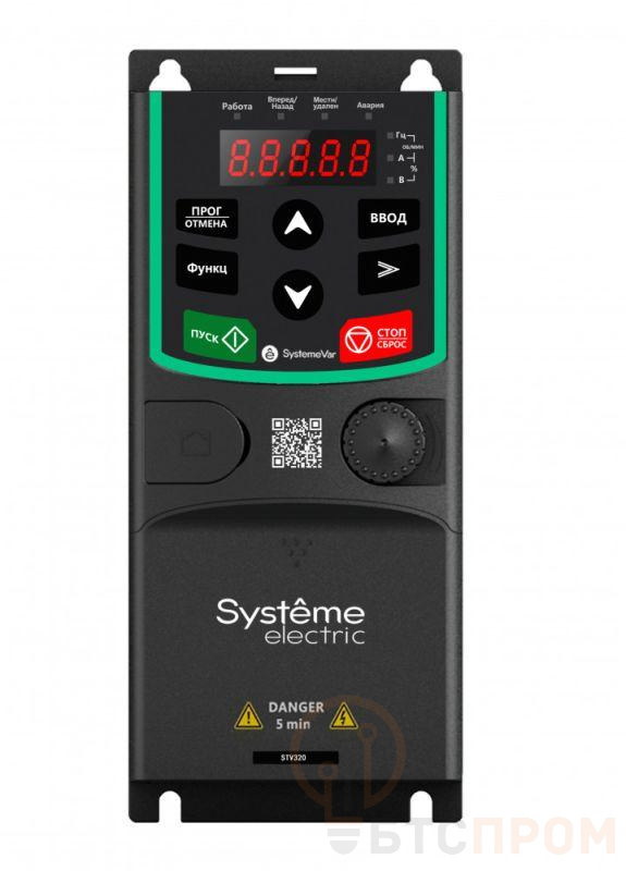 Преобразователь частоты SystemeVar 320 (STV320). Номинальная мощность: 2,2 кВт (G-тип: перегрузочная способность: 150% в течение 60с, 180% в течение 10с, 200% в течение 1с. Несущая частота ШИМ: 8 кГц). Номинальный ток: 24 А (G-тип). Питающее напряжение 1Ф 220В (-15%) ~ 240В (+10%). Степень защиты IP20. Габаритные размеры (ДхШхВ), мм: 80х140,5х185. Вес: 1,2 кг.