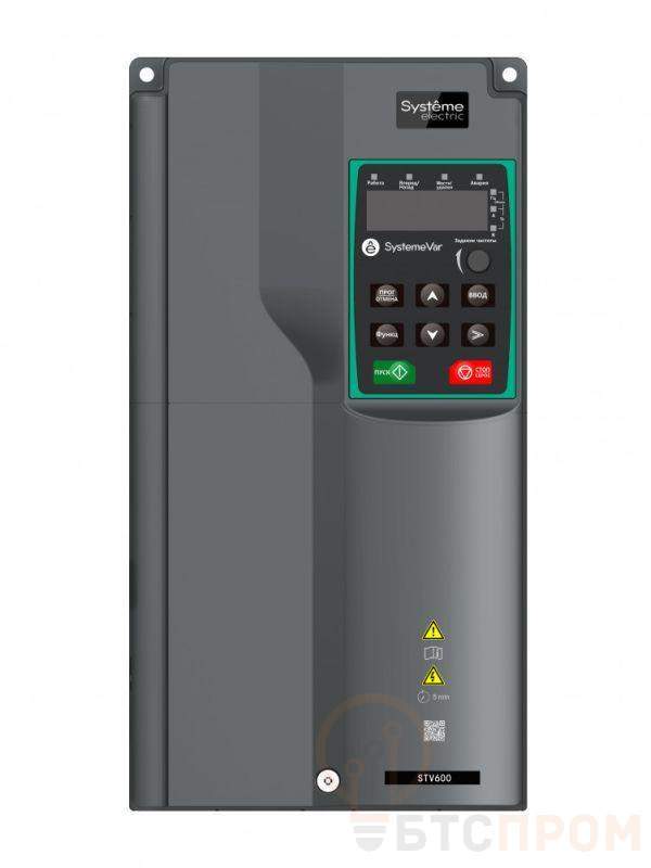 Преобразователь частоты серии SystemeVar, типа STV600 для насосных и вентиляторных применений. Номинальные характеристики (P-тип): Un = 3Ф 400В; Pn = 22 кВт; In = 45 А. Диапазон питающего напряжения: 3Ф 380В (-15%) ~ 440В (+10%). Номинальная мощность: 22 кВт (P-тип: 110% в течение 60с. Номинальный ток: 45 А (P-тип). Выходная частота: до 400 Гц. Встроенный ЭМС-фильтр (Класс С2, согл. EN 61800-3). Без встроенного DC-реактора. Без встроенного моторного дросселя. Панель оператора: LED интегрированная, несъёмная (опционально доступны: выносная LED (SEOP-1203) и выносная LCD (SEOP-1205) панели оператора). Интерфейс расширения функциональности: 2 слота (SLOT1, SLOT2). Встроенный протокол связи: Modbus RTU (опционально доступны: PROFIBUS DP (SEOP-1301), PROFINET (SEOP-1302), CAN/CANopen (SEOP-1307). Кол-во входов/выходов: 6DI, 2AI, 1DO, 2AO, 1RO* (опционально доступны: плата расширения входов/выходов: SEOP-1628 (+ 4DI, 1AI, 1DO, 2RO), плата расширения релейных входов/выходов SEOP-1630 (+2DI, 6RO). Примечание “1RO*” – 2RO только для STV600, произведённых после 15 марта 2023 года (они имеют круглую дополнительную маркировку на упаковке “QCPASS”). Поддерживает ПО для ввода в эксплуатацию и диагностики (SystemeVAR Studio). Степень защиты IP20. Скалярное и векторное (без датчика обратной связи) управление. Функции для насосных и вентиляторных применений. Пожарный режим. Монтаж: настенный, фланцевый. Тип монтажа: встраиваемый (подразумевается установка в оболочку (шкаф управления). Конформное покрытие печатных плат (Класс 3С3, согл. EN 60721-3-3). Температура окружающей среды: от -10°C до +50°C (до +40°C без ухудшения номинальных характеристик). Охлаждение: принудительное. Габаритные размеры (ШхВхГ), мм: 169х320х214. Вес: 5,2 кг.