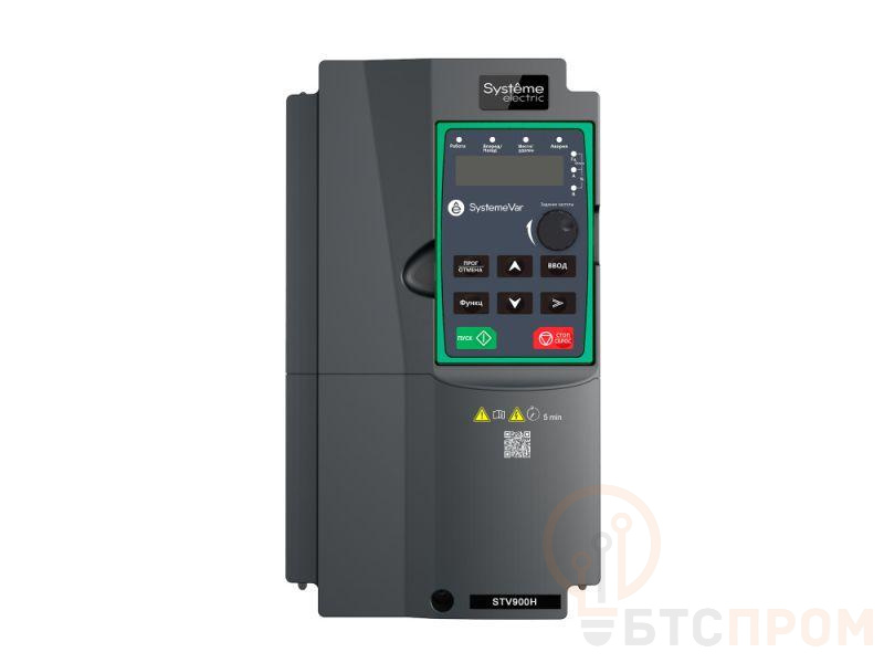 Преобразователь частоты SystemeVar 900H (STV900H). Номинальная мощность: 7,5 кВт (G-тип: перегрузочная способность: 150% в течение 60с, 180% в течение 10с, 200% в течение 1с. Несущая частота ШИМ: 8 кГц). Номинальный ток: 18,5 А (G-тип). Питающее напряжение 3Ф 380В (-15%) ~ 440В (+10%). Степень защиты IP20. Габаритные размеры (ДхШхВ), мм: 146х192х256. Вес: 3 кг. Встроенный модуль торможения, функция безопасности STO (Safe Torque Off), функция управление тормозом и другие функции для крановых применений. Целевое применение: Кран/Подъемник.