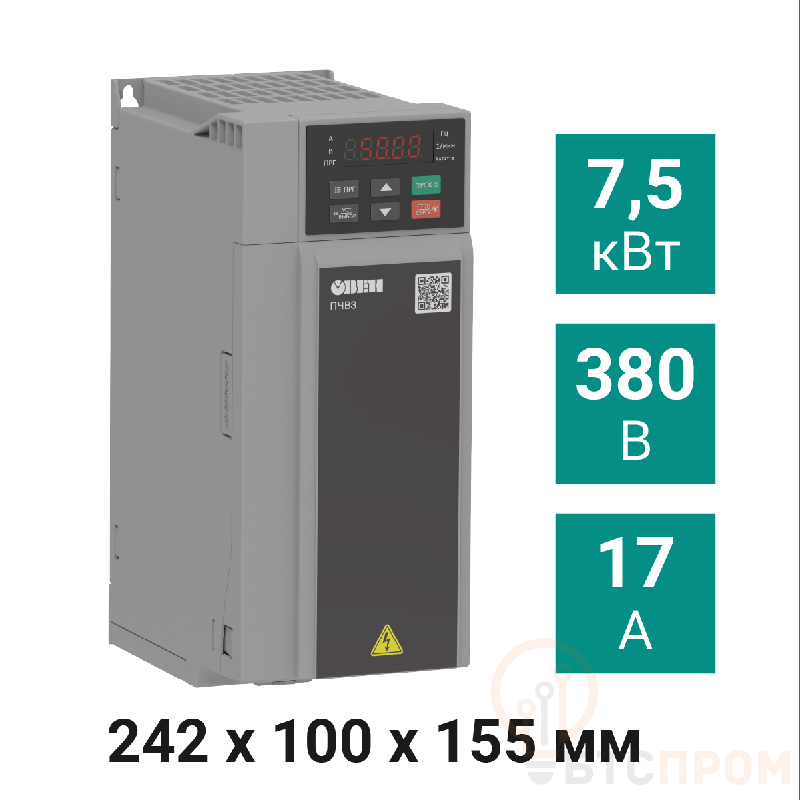 Векторный преобразователь частоты ПЧВ3-7К5-В от компании ОВЕН — это современное высокотехнологичное устройство для точного управления скоростью вращения трехфазных асинхронных электродвигателей. Преобразователь обеспечивает плавный пуск и остановку двигателя, что значительно увеличивает его срок службы и снижает механические нагрузки на оборудование.
