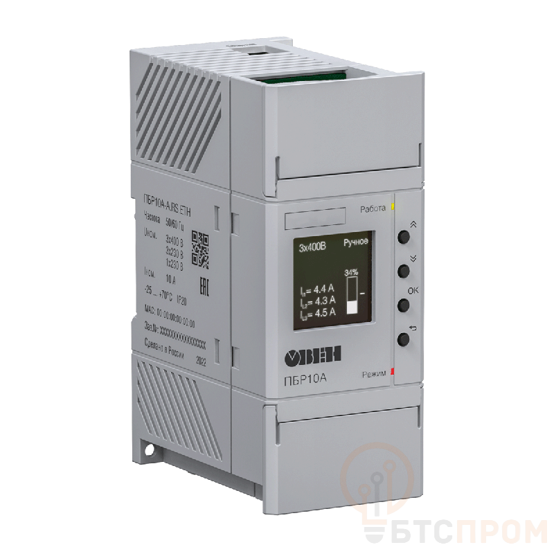 Пускатель реверсивный ПБР10А-Д.A.RS.ETH от ОВЕН – современное устройство для управления трехфазными асинхронными электродвигателями. Он обеспечивает прямой пуск, остановку и реверс вращения двигателя, а также его защиту от перегрузок и обрыва фаз. Модель оснащена встроенным модулем Ethernet, что позволяет интегрировать его в системы АСУ ТП для удаленного контроля и управления через сеть.