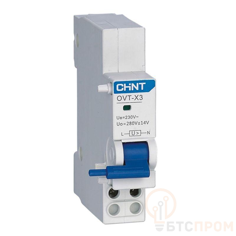 Расцепитель максимального напряжения серии OVT-X3 предназначен для аварийного отключения автоматического выключателя при обнаружении повышения фазного напряжения, также может быть использован для дистанционного отключения автоматического выключателя. Расцепитель срабатывает при достижении порогового значения напряжения на его катушке. Он устанавливается с правой стороны выключателя и прищелкивается к нему. Основные характеристики: Напряжение управления – АС240В Уставка срабатывания защиты от повышения напряжения – АС280В (1 ± 5%) Напряжение гарантированного неотключения – 0,85–1,10Ue Механическая износостойкость – 4000 циклов В/О Электрическая износостойкость – 4000 циклов В/О Степень загрязнения – 2 Степень защиты – IP20 Ширина – 18 мм Монтаж – на симметричную DIN-рейку 35 мм Расцепитель максимального напряжения серии OVT-X3 может применяться с автоматическими выключателями серии NXB-125.