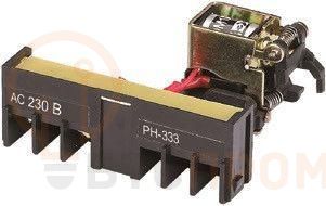 Расцепитель независимый серии РН-332 отключает автоматический выключатель серии ВА-332 при подаче на его клеммы номинального напряжения, которое указано на корпусе. Конструктивно представляет собой электромагнит, который через рычаг воздействует на механизм сброса автоматического выключателя и устанавливается в корпус выключателя с правой стороны.