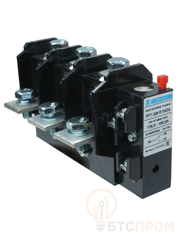Реле тепловое РТТ-326 П УХЛ4 160А IP00 от производителя «Электротехник» (артикул ET512153) — это надежный аппарат защиты асинхронных электродвигателей от перегрузок недопустимой продолжительности и перекоса фаз.