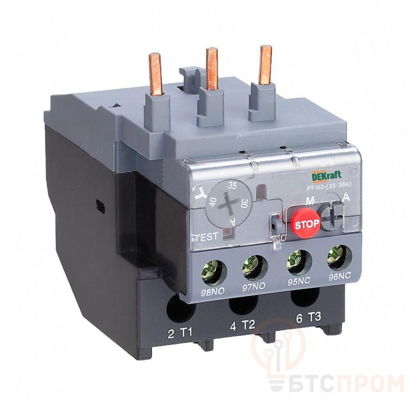 Тепловое реле перегрузки серии РТ-02 Dekraft; предназначено для применения с контакторами КМ-102 на ток 38 А; трехполюсное; диапазон уставок реле 30,0-40,0 А; класс расцепления 10А; два режима повторного включения - ручной и автоматический. Тепловые реле РТ-02 применяются для защиты цепей переменного тока и электродвигателей от перегрузки, асимметрии фаз, затянутого пуска и заклинивания ротора. Реле подходит к соответствующим контакторам других производителей.