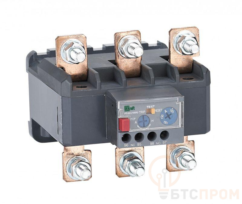Тепловое реле перегрузки серии РТ-02 Dekraft; предназначено для применения с контакторами КМ-102 на ток 115-185 А; трехполюсное; диапазон уставок реле 55-70 А; класс расцепления 10; два режима повторного включения - ручной и автоматический. Тепловые реле РТ-02 применяются для защиты цепей переменного тока и электродвигателей от перегрузки, асимметрии фаз, затянутого пуска и заклинивания ротора. Реле подходит к соответствующим контакторам других производителей.