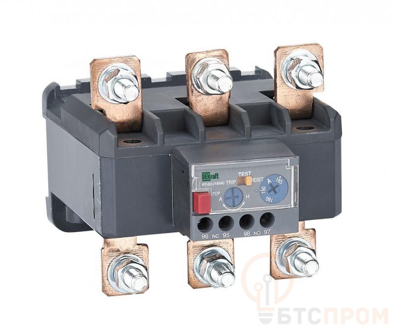 Тепловое реле перегрузки серии РТ-02 Dekraft; предназначено для применения с контакторами КМ-102 на ток 115-185 А; трехполюсное; диапазон уставок реле 90-115 А; класс расцепления 10; два режима повторного включения - ручной и автоматический. Тепловые реле РТ-02 применяются для защиты цепей переменного тока и электродвигателей от перегрузки, асимметрии фаз, затянутого пуска и заклинивания ротора. Реле подходит к соответствующим контакторам других производителей.