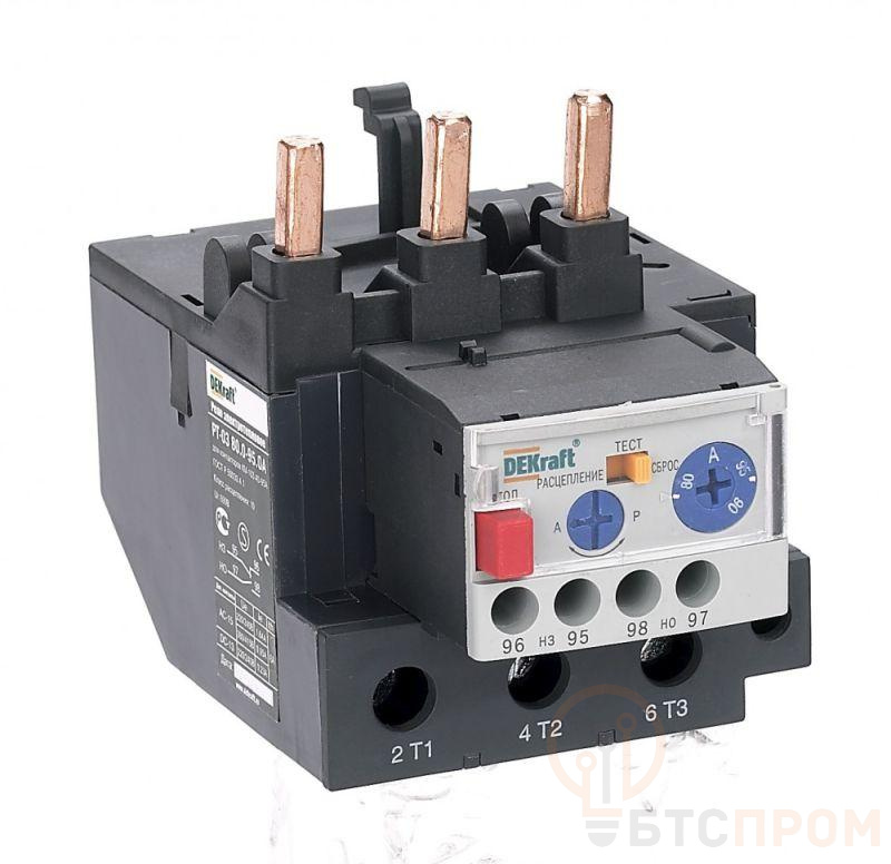 Тепловое реле перегрузки серии РТ-03 Dekraft; предназначено для применения с контакторами КМ-103 на ток 40-95 А; трехполюсное; диапазон уставок реле 63-80 А; класс расцепления 10А; два режима повторного включения - ручной и автоматический. Тепловые реле РТ-03 применяются для защиты цепей переменного тока и электродвигателей от перегрузки, асимметрии фаз, затянутого пуска и заклинивания ротора. Реле подходит к соответствующим контакторам других производителей.
