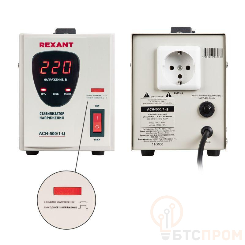 Однофазный стабилизатор переменного напряжения релейного типа марки REXANT предназначен для защиты бытовых и промышленных электроприборов от перепадов напряжения в сети и токов короткого замыкания. При отклонении входного напряжения от нормы, устройство стабилизирует его, благодаря чему подключенное оборудование можно использовать, не опасаясь поломки. Рассчитан на диапазон входного напряжения от 140 до 260 В. При превышении предельных значений срабатывает аварийное отключение нагрузки. Выходное напряжение поддерживается на уровне 220±8% В. На корпусе стабилизатора размещена индикация основных режимов работы, а также уровней напряжения на входе и выходе. Оснащен защитой от пониженного и повышенного напряжения, перегрева и токов короткого замыкания.
