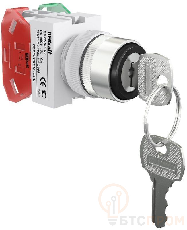 Переключатель серии ПЕ-22 Dekraft; исполнение - 1 фикс.положение (0) и 1 без фиксации (I); кол-во контактов – 1НО+1НЗ; замок с ключом; без индикации; ном.ток 10 А; установка - на панели или двери; степень защиты - IP54; подключение - винтовыми зажимами. Переключатели применяются для коммутации электрических цепей и индикации состояния устройств в сетях напряжением до 660В пер. тока. Могут устанавливаться на подвижных и неподвижных частях стационарных установок.
