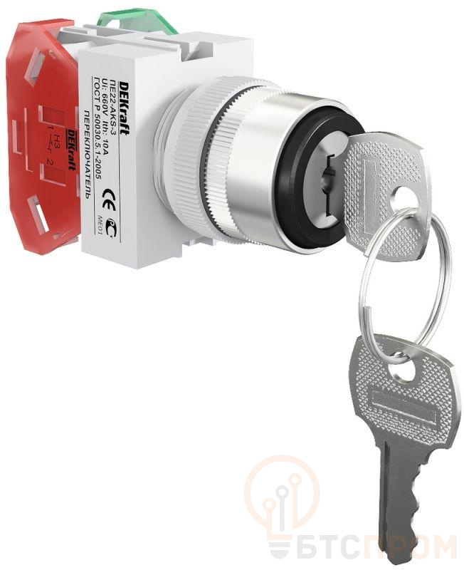 Переключатель серии ПЕ-22 Dekraft; исполнение - 2 фикс.положения (II-0) и 1 без фиксации (I); кол-во контактов – 2НО; замок с ключом; без индикации; ном.ток 10 А; установка - на панели или двери; степень защиты - IP54; подключение - винтовыми зажимами. Переключатели применяются для коммутации электрических цепей и индикации состояния устройств в сетях напряжением до 660В пер. тока. Могут устанавливаться на подвижных и неподвижных частях стационарных установок.