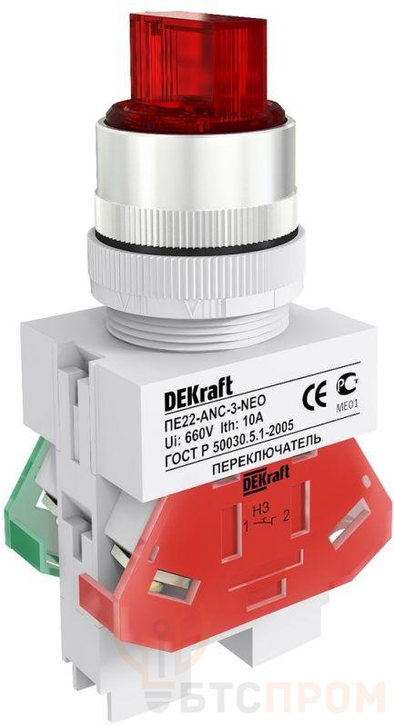 Переключатель серии ПЕ-22 Dekraft; исполнение - 3 фикс. положения (I-0-II); кол-во контактов – 1НО+1НЗ; стандартная ручка красного цвета; с неоновой лампой; ном.ток 10 А; установка - на панели или двери; степень защиты - IP54; подключение - винтовыми зажимами. Переключатели применяются для коммутации электрических цепей и индикации состояния устройств в сетях напряжением до 660В пер. тока. Могут устанавливаться на подвижных и неподвижных частях стационарных установок.