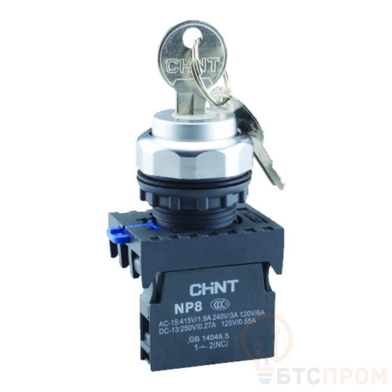 Переключатель с ключом NP8-10Y/21 — это надежный аппарат управления от бренда CHINT, предназначенный для коммутации электрических цепей в стационарных установках. Модель оснащена тремя положениями с фиксацией, что обеспечивает стабильность выбранного режима работы. Коммутационная группа включает 1 нормально разомкнутый (1НО) и 1 нормально замкнутый (1НЗ) контакт, обеспечивая гибкость в построении схем управления.
