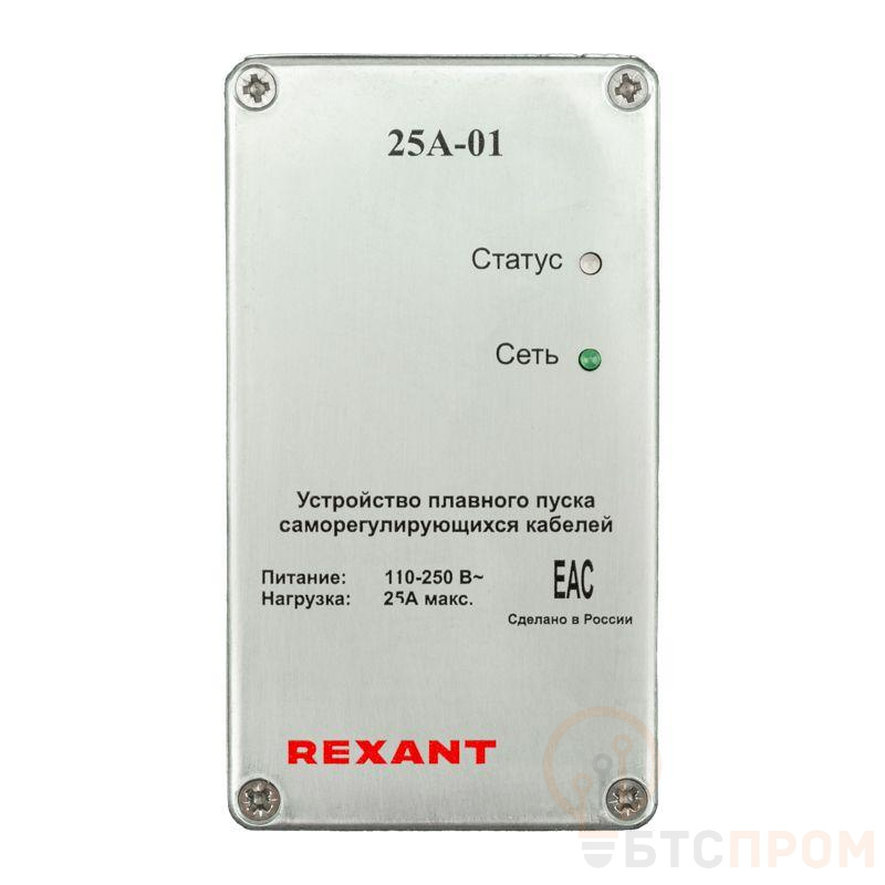Устройство плавного пуска 25А-01 предназначено для коммутации саморегулирующихся нагревательных кабелей без необходимости использования мощных пускателей и защитной автоматики избыточной мощности. Это достигается за счет ограничения пусковых токов на уровне номинальных. Плавный пуск 25А-01 предназначен для установки в шкафу управления. Корпус прибора монтируется на DIN-рейку. Плавный пуск саморегулирующегося кабеля обеспечивается за счет работы полупроводникового коммутатора, лежащего в основе прибора. Время запуска кабеля составляет 10 – 20 минут в зависимости от коммутируемой нагрузки и температуры прибора. Максимальный ток нагрузки – 25 А.