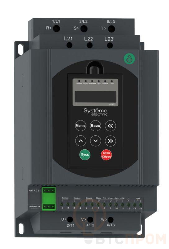 Устройство плавного пуска SystemeStart 22 (STS22) предназначено для контролируемого пуска/останова простых и сложных машин и механизмов. Номинальная мощность: 15 кВт. Номинальный ток: 32 А. Без встроенного байпасного контактора (обязательно должен использован внешний). Встроенный Modbus RTU. Конформное покрытие плат: Класс 3С2 (согл. EN 60721?3?3). Количество пусков: ? 12 раз/ч. Питающее напряжение: 3Ф 380В (-15%) ~ 440В (+10%). Степень защиты: IP20. Охлаждение: естественное воздушное, с раздельными изолированными воздушными каналами. Габаритные размеры (ШхВхГ), мм: 160х265х164. Вес: 3 кг.