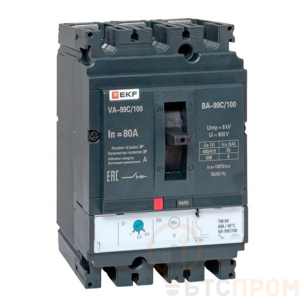 Выключатель ВА-99С выполнен в виде моноблока и состоит из основания и крышки с фальш-панелью, в которой имеется окно для рукоятки управления и толкатель кнопки «Тест» – для проверки механизма отключения выключателя.Основание выполнено из термостойкой пластмассы, не поддерживающей горение и являющейся несущей конструкцией для присоединительных зажимов, блок ротоактивных контактов с двумя дугогасительными камерами представляет собой жесткую сборку в отдельном корпусе, механизма управления, блока защиты от сверхтоков и перегрузки (расцепителя). Крышка закрывает все подвижные элементы механизма управления и внутренние токоведущие части.