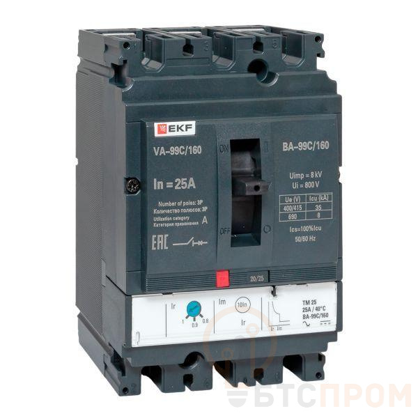 Выключатель ВА-99С выполнен в виде моноблока и состоит из основания и крышки с фальш-панелью, в которой имеется окно для рукоятки управления и толкатель кнопки «Тест» – для проверки механизма отключения выключателя.Основание выполнено из термостойкой пластмассы, не поддерживающей горение и являющейся несущей конструкцией для присоединительных зажимов, блок ротоактивных контактов с двумя дугогасительными камерами представляет собой жесткую сборку в отдельном корпусе, механизма управления, блока защиты от сверхтоков и перегрузки (расцепителя). Крышка закрывает все подвижные элементы механизма управления и внутренние токоведущие части.