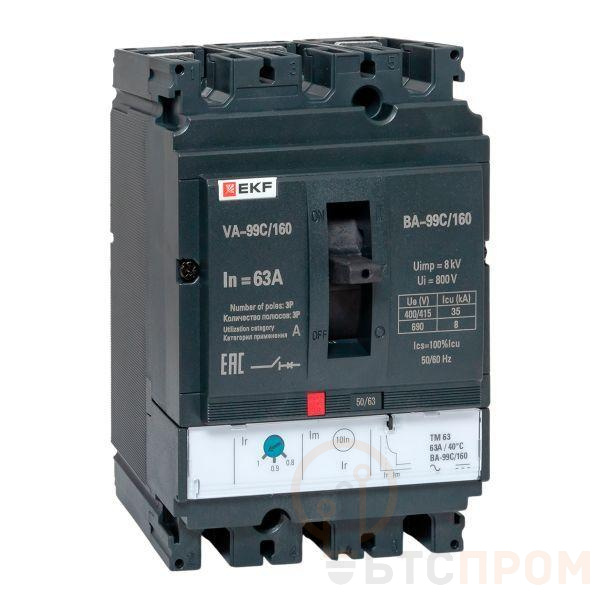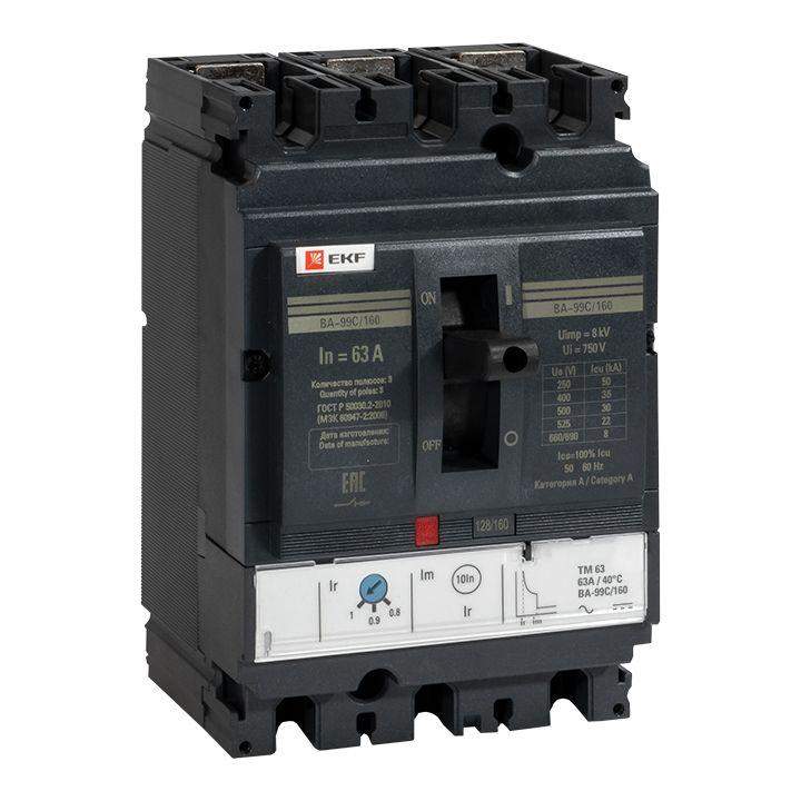 Выключатель ВА-99С выполнен в виде моноблока и состоит из основания и крышки с фальш-панелью, в которой имеется окно для рукоятки управления и толкатель кнопки «Тест» – для проверки механизма отключения выключателя.Основание выполнено из термостойкой пластмассы, не поддерживающей горение и являющейся несущей конструкцией для присоединительных зажимов, блок ротоактивных контактов с двумя дугогасительными камерами представляет собой жесткую сборку в отдельном корпусе, механизма управления, блока защиты от сверхтоков и перегрузки (расцепителя). Крышка закрывает все подвижные элементы механизма управления и внутренние токоведущие части.