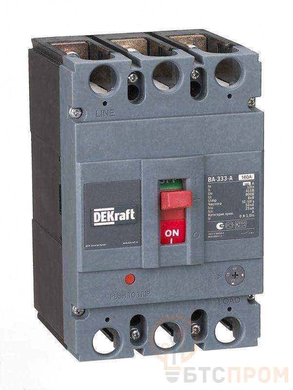 Автоматический выключатель серии ВА-333 DEKraft; 3P; номинальный ток 160 А, отключающая способность Icu = 50 кА (при 415 В 50 Гц); расцепитель – термомагнитный, регулируемый. В комплект поставки входят 4 межфазные перегородки и крепеж на монтажной плате. В дополнение к выключателям выпускается ряд аксессуаров, расширяющих их функционал: сигнальные контакты, расцепители напряжения, моторные приводы, шины выносные и др.
