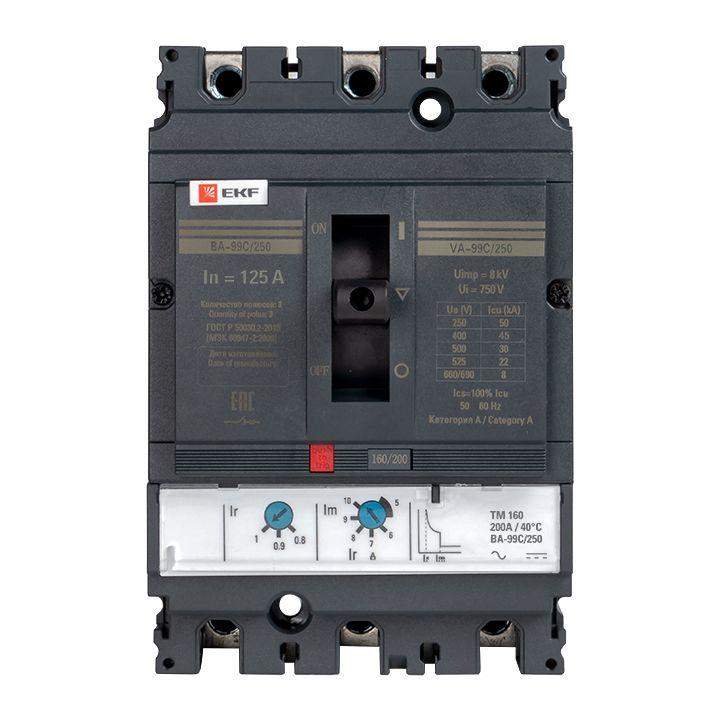 Выключатель ВА-99С выполнен в виде моноблока и состоит из основания и крышки с фальш-панелью, в которой имеется окно для рукоятки управления и толкатель кнопки «Тест» – для проверки механизма отключения выключателя.Основание выполнено из термостойкой пластмассы, не поддерживающей горение и являющейся несущей конструкцией для присоединительных зажимов, блок ротоактивных контактов с двумя дугогасительными камерами представляет собой жесткую сборку в отдельном корпусе, механизма управления, блока защиты от сверхтоков и перегрузки (расцепителя). Крышка закрывает все подвижные элементы механизма управления и внутренние токоведущие части.