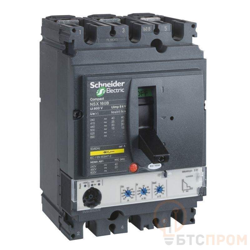 Автоматический выключатель ComPact NSX160B, исполнение – 3P3d; номинальный ток 160 А; Icu = 25 kA 380/415 В; Ics = 100% Icu; с электронным расцепителем Micrologic 2.2 (защита LSOI); ШхВхГ – 105x161x86 мм; исполнение – стационарный; монтаж - на плате. Аппараты ComPact NSX обеспечивают защиту распределительных сетей до 690В от перегрузок и коротких замыканий.