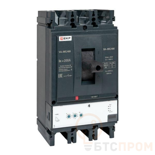 Выключатель ВА-99С выполнен в виде моноблока и состоит из основания и крышки с фальш-панелью, в которой имеется окно для рукоятки управления и толкатель кнопки «Тест» – для проверки механизма отключения выключателя.Основание выполнено из термостойкой пластмассы, не поддерживающей горение и являющейся несущей конструкцией для присоединительных зажимов, блок ротоактивных контактов с двумя дугогасительными камерами представляет собой жесткую сборку в отдельном корпусе, механизма управления, блока защиты от сверхтоков и перегрузки (расцепителя). Крышка закрывает все подвижные элементы механизма управления и внутренние токоведущие части.